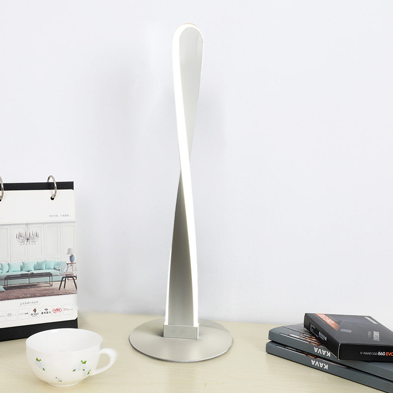 - An amazing piece of fine art decor doubles as a dimmable of ambient lighting, as this minimalist LED table lamp brings a dynamic lighting to modern spaces. This energy-efficient LED lamp creates an attractive aesthetic with a twisting flat column silhouette. A sleek black or white iron finish over metal construction features a 10-watt acrylic LED strinp around the lamp fixture. An in-line dimmer control by touch provides different lighting levels for your wanted needs.